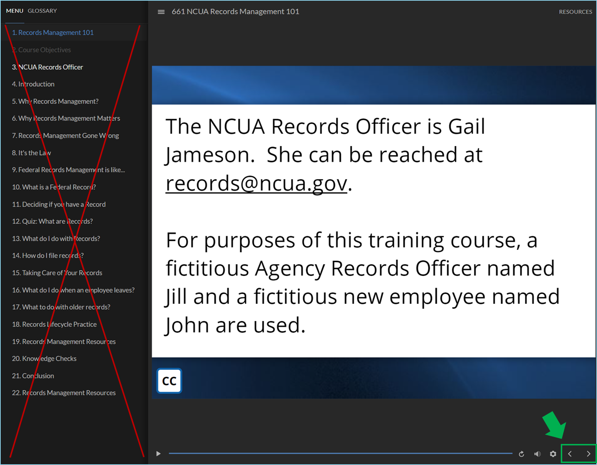 5. To move from slide to slide, always use the NEXT button in the lower right corner (It looks like this >) instead of the Menu Navigation. [see image below]