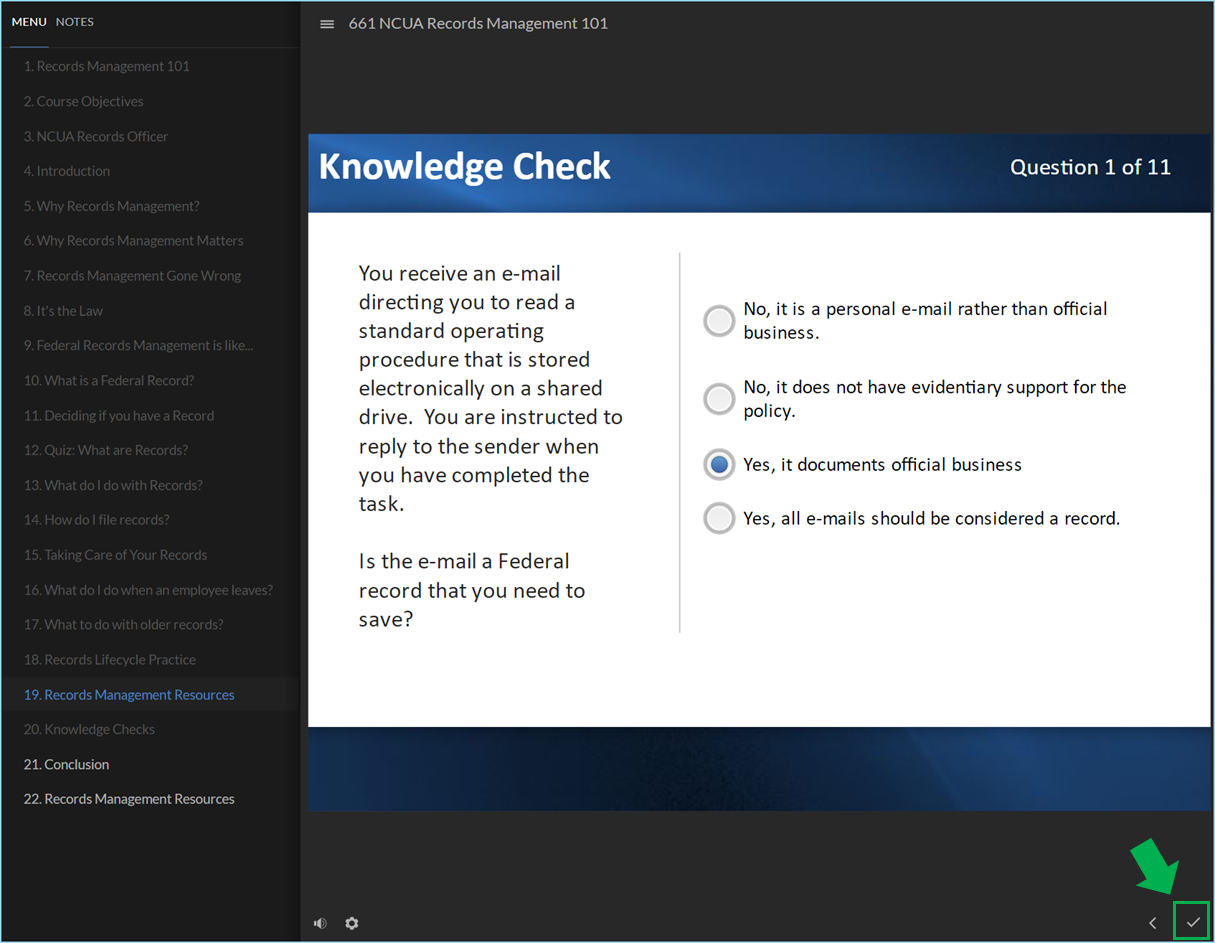 6. On each knowledge check, select the answer; then be sure to click the SUBMIT button, or your answer will not register. (The submit button is in the lower right corner and looks like a checkmark) [see image below]