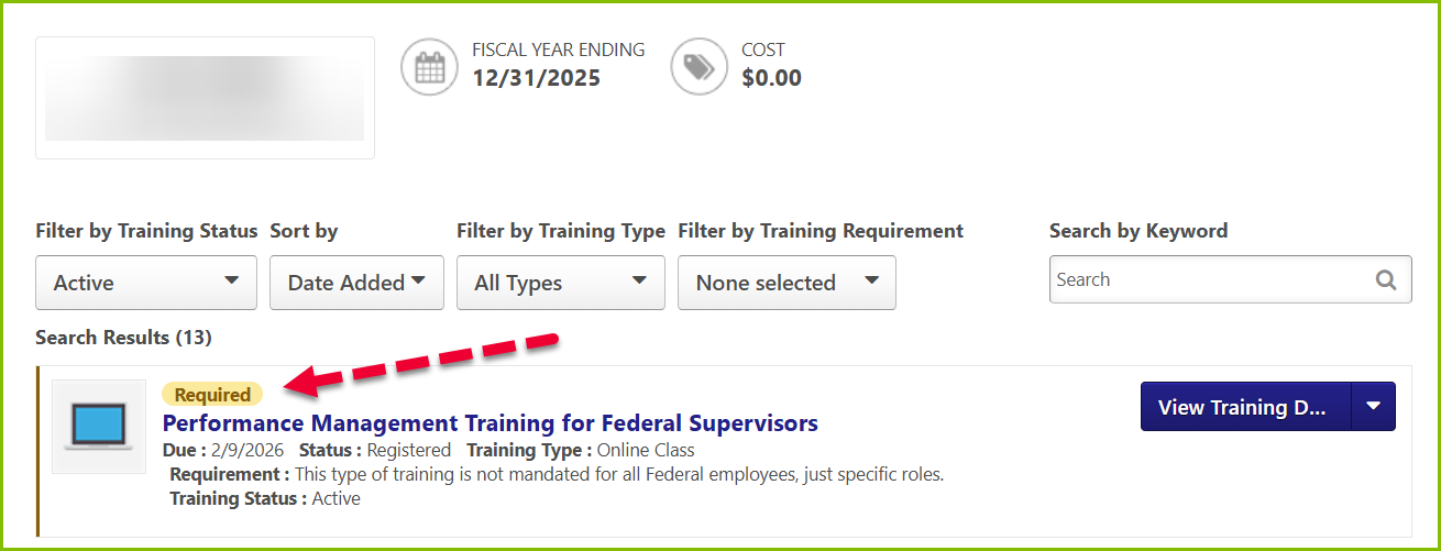 Kindly note that the Performance Management Training for Federal Supervisors was automatically assigned to all NCUA Supervisors. You can find it in your Transcript under Active or Required, where it will be marked with a 'Required' tag.